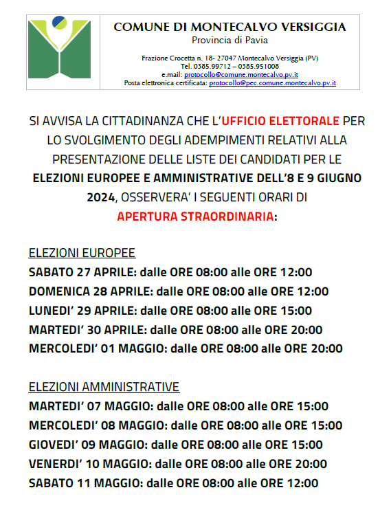 Si avvisa la cittadinanza che l’ufficio elettorale per lo svolgimento degli adempimenti relativi alla presentazione delle liste dei candidati per le elezioni europee e amministrative dell’8 e 9 giugno 2024, osserverà i seguenti orari di apertura straordinaria: